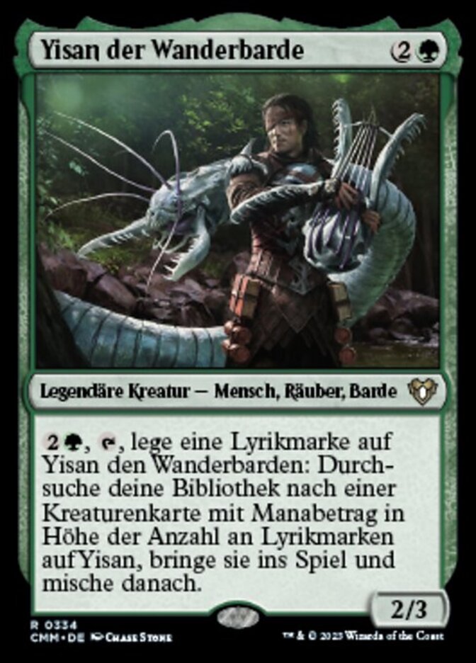 | Rules | , , Put a verse counter on Yisan, the Wanderer Bard: Search your library for a creature card with mana value equal to the number of verse counters on Yisan, put it onto the battlefield, then shuffle. |
