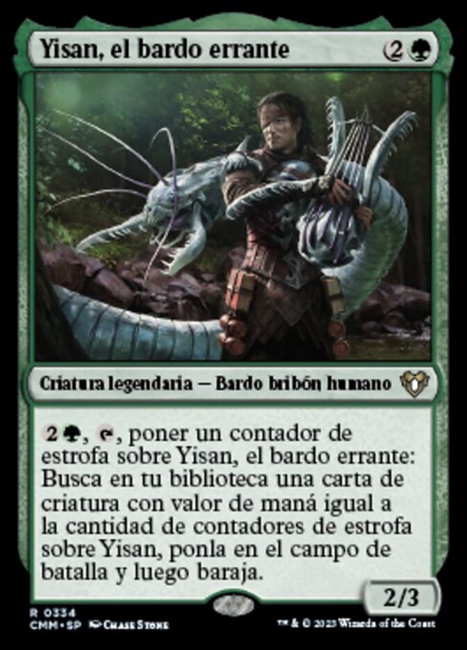 | Rules | , , Put a verse counter on Yisan, the Wanderer Bard: Search your library for a creature card with mana value equal to the number of verse counters on Yisan, put it onto the battlefield, then shuffle. |