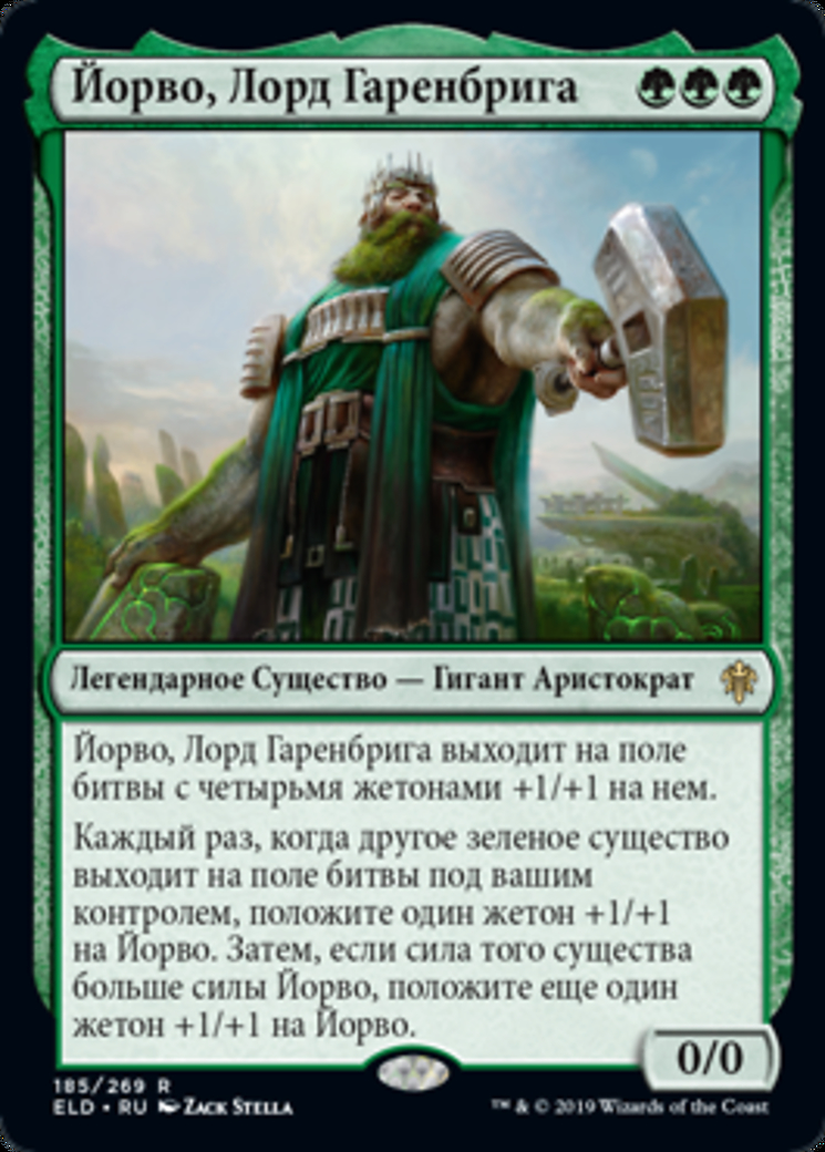 | Rules | Yorvo, Lord of Garenbrig enters the battlefield with four +1/+1 counters on it. Whenever another green creature enters the battlefield under your control, put a +1/+1 counter on Yorvo. Then if that creature's power is greater than Yorvo's power, put another +1/+1 counter on Yorvo. |