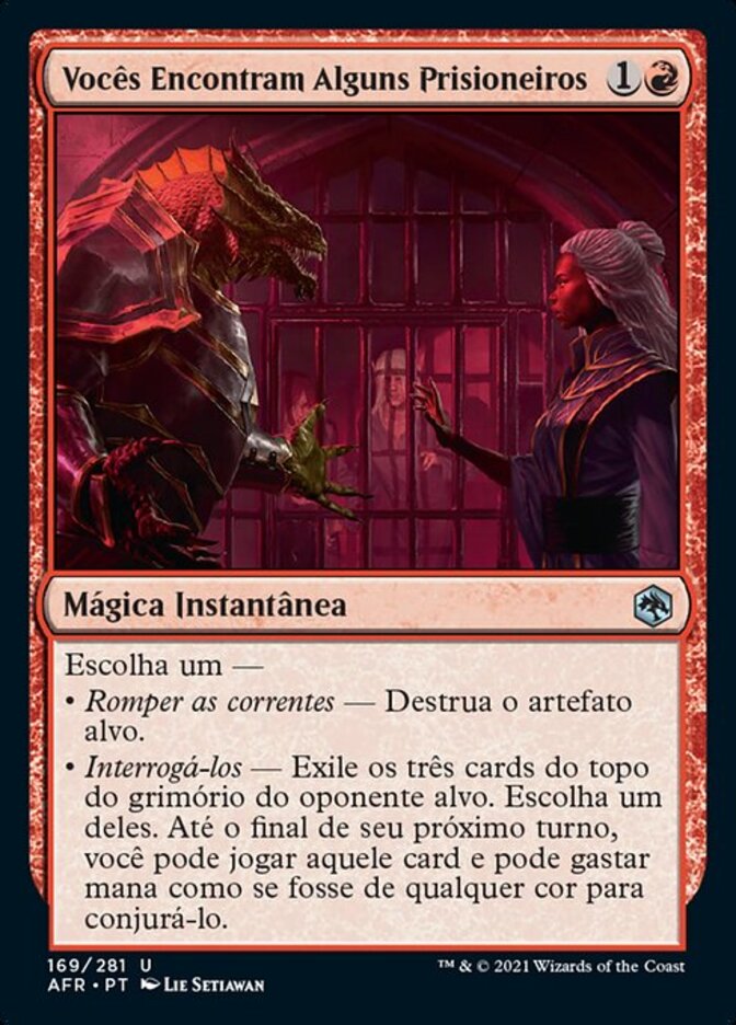 | Rules | Choose one — • Break Their Chains — Destroy target artifact. • Interrogate Them — Exile the top three cards of target opponent's library. Choose one of them. Until the end of your next turn, you may play that card, and you may spend mana as though it were mana of any color to cast it. |