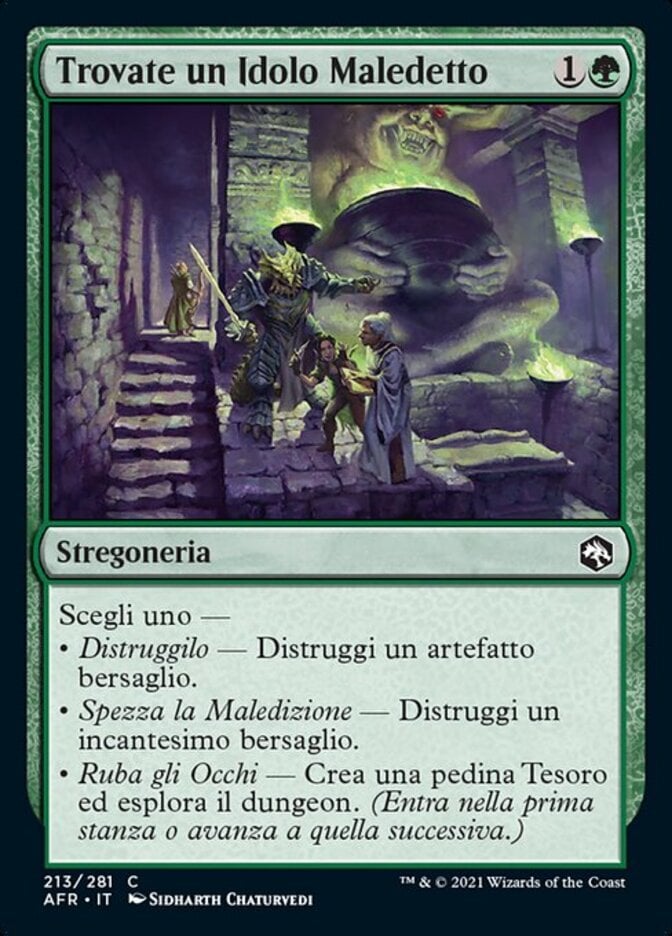 | Rules | Choose one — • Smash It — Destroy target artifact. • Lift the Curse — Destroy target enchantment. • Steal Its Eyes — Create a Treasure token and venture into the dungeon. (Enter the first room or advance to the next room.) |