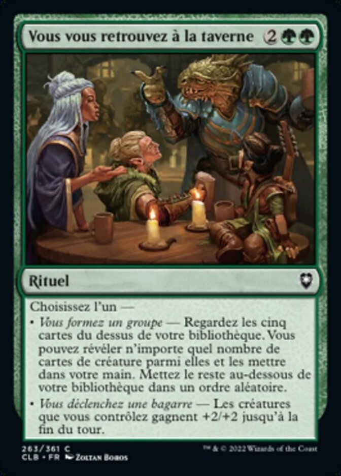 | Rules | Choose one — • Form a Party — Look at the top five cards of your library. You may reveal any number of creature cards from among them and put them into your hand. Put the rest on the bottom of your library in a random order. • Start a Brawl — Creatures you control get +2/+2 until end of turn. |