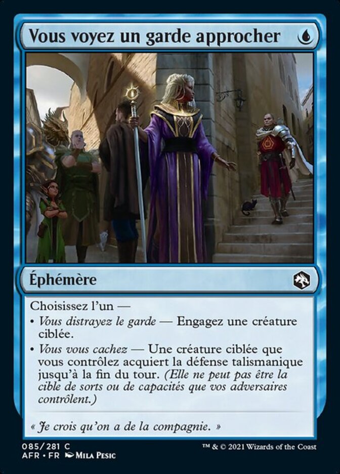 | Rules | Choose one — • Distract the Guard — Tap target creature. • Hide — Target creature you control gains hexproof until end of turn. (It can't be the target of spells or abilities your opponents control.) |