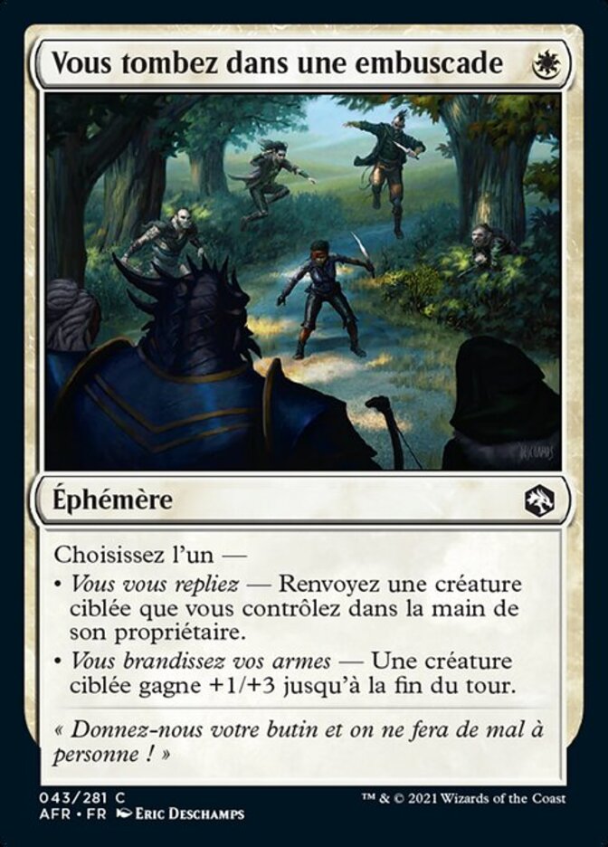 | Rules | Choose one — • Make a Retreat — Return target creature you control to its owner's hand. • Stand and Fight — Target creature gets +1/+3 until end of turn. |