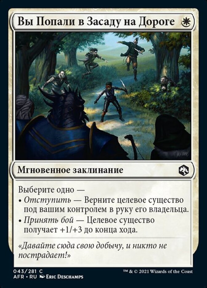 | Rules | Choose one — • Make a Retreat — Return target creature you control to its owner's hand. • Stand and Fight — Target creature gets +1/+3 until end of turn. |