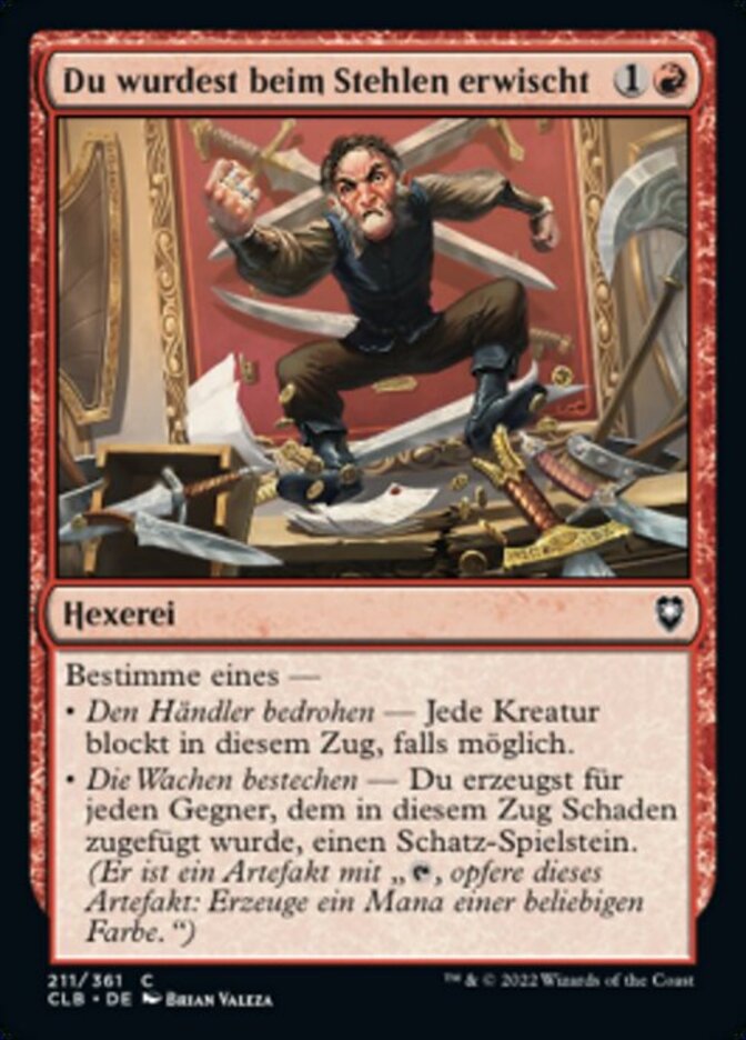 | Rules | Choose one — • Threaten the Merchant — Each creature blocks this turn if able. • Bribe the Guards — You create a Treasure token for each opponent who was dealt damage this turn. (It's an artifact with ", Sacrifice this artifact: Add one mana of any color.") |