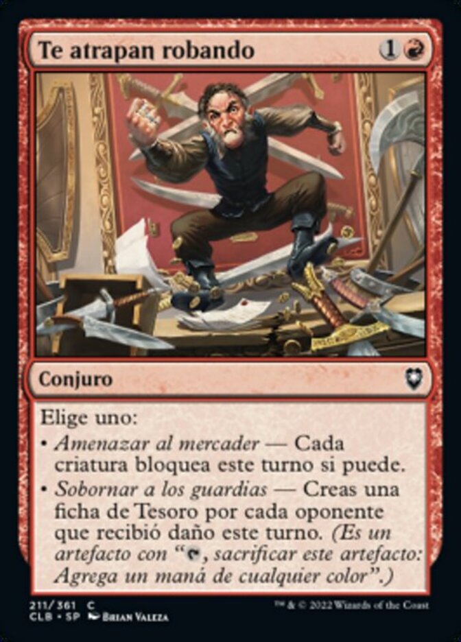 | Rules | Choose one — • Threaten the Merchant — Each creature blocks this turn if able. • Bribe the Guards — You create a Treasure token for each opponent who was dealt damage this turn. (It's an artifact with ", Sacrifice this artifact: Add one mana of any color.") |