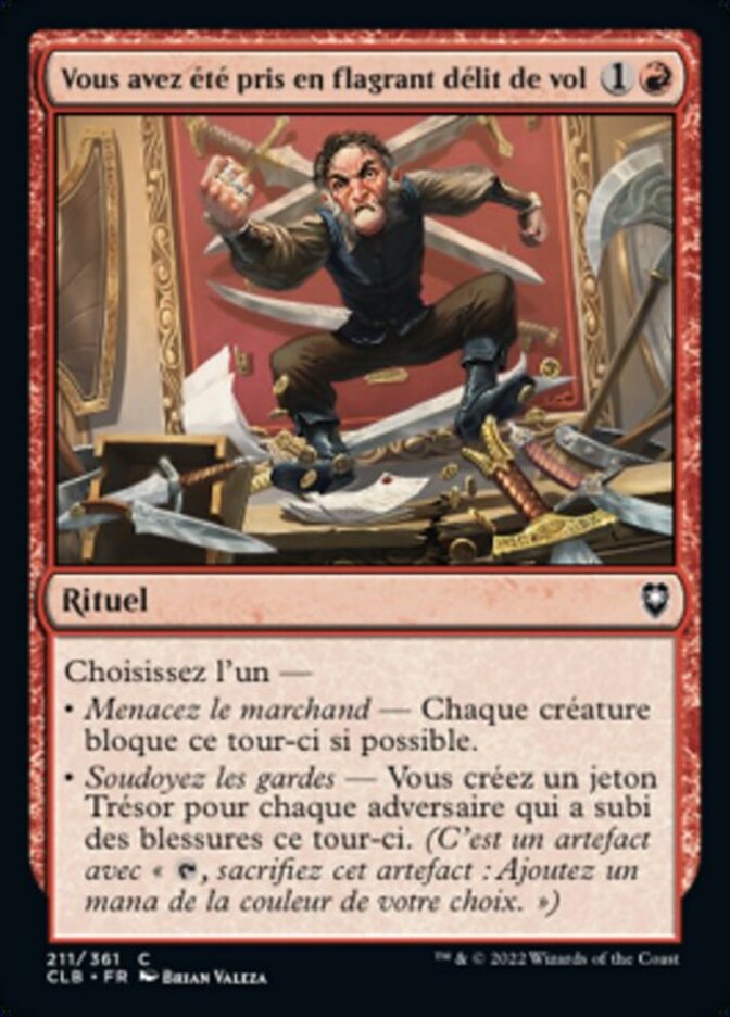 | Rules | Choose one — • Threaten the Merchant — Each creature blocks this turn if able. • Bribe the Guards — You create a Treasure token for each opponent who was dealt damage this turn. (It's an artifact with ", Sacrifice this artifact: Add one mana of any color.") |