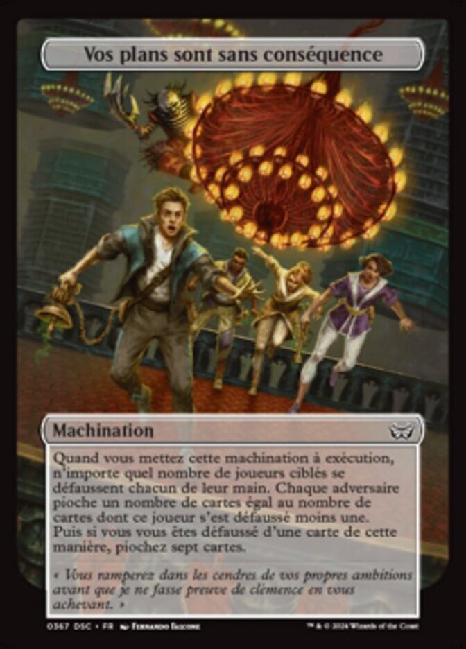 | Rules | When you set this scheme in motion, any number of target players each discard their hands. Each opponent draws cards equal to the number of cards that player discarded minus one. Then if you discarded a card this way, draw seven cards. |
