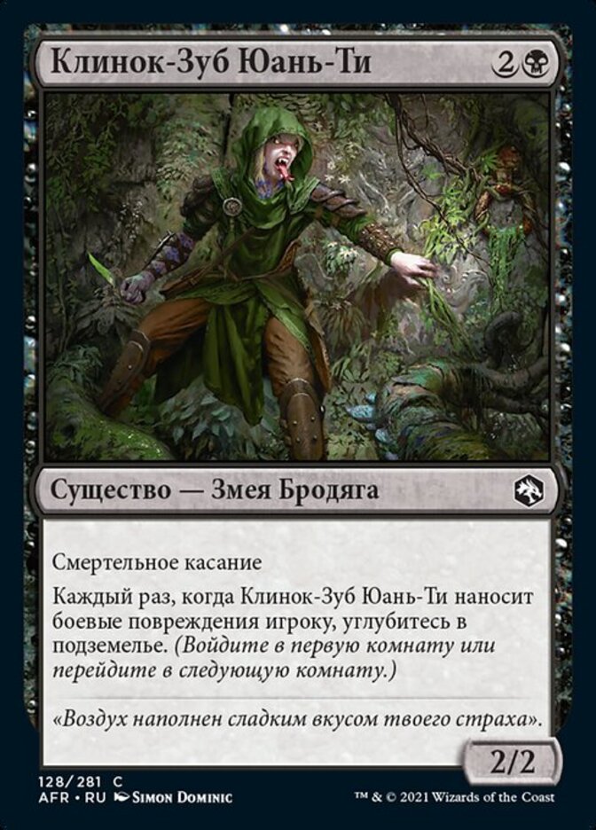| Rules | Deathtouch Whenever Yuan-Ti Fang-Blade deals combat damage to a player, venture into the dungeon. (Enter the first room or advance to the next room.) |