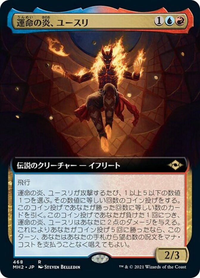 | Rules | Flying Whenever Yusri, Fortune's Flame attacks, choose a number between 1 and 5. Flip that many coins. For each flip you win, draw a card. For each flip you lose, Yusri deals 2 damage to you. If you won five flips this way, you may cast spells from your hand this turn without paying their mana costs. |