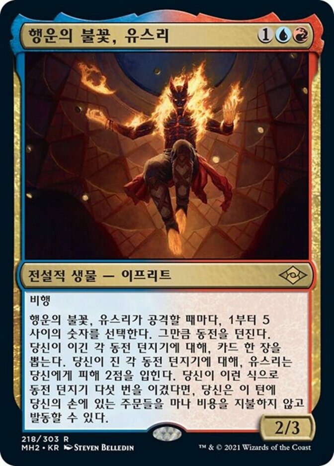 | Rules | Flying Whenever Yusri, Fortune's Flame attacks, choose a number between 1 and 5. Flip that many coins. For each flip you win, draw a card. For each flip you lose, Yusri deals 2 damage to you. If you won five flips this way, you may cast spells from your hand this turn without paying their mana costs. |