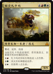 | Rules | Vigilance, reach, trample When Zacama, Primal Calamity enters the battlefield, if you cast it, untap all lands you control. : Zacama deals 3 damage to target creature. : Destroy target artifact or enchantment. : You gain 3 life. |