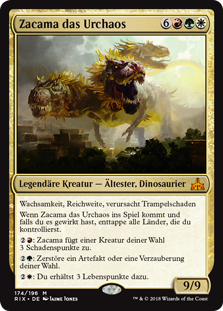 | Rules | Vigilance, reach, trample When Zacama, Primal Calamity enters the battlefield, if you cast it, untap all lands you control. : Zacama deals 3 damage to target creature. : Destroy target artifact or enchantment. : You gain 3 life. |