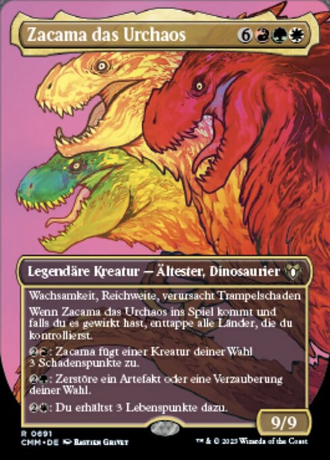 | Rules | Vigilance, reach, trample When Zacama, Primal Calamity enters the battlefield, if you cast it, untap all lands you control. : Zacama deals 3 damage to target creature. : Destroy target artifact or enchantment. : You gain 3 life. |