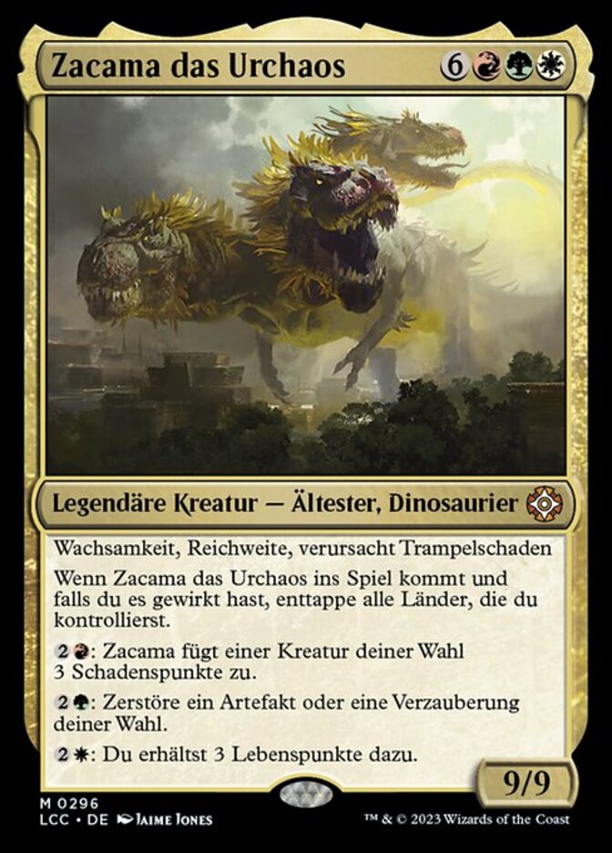 | Rules | Vigilance, reach, trample When Zacama, Primal Calamity enters the battlefield, if you cast it, untap all lands you control. : Zacama deals 3 damage to target creature. : Destroy target artifact or enchantment. : You gain 3 life. |