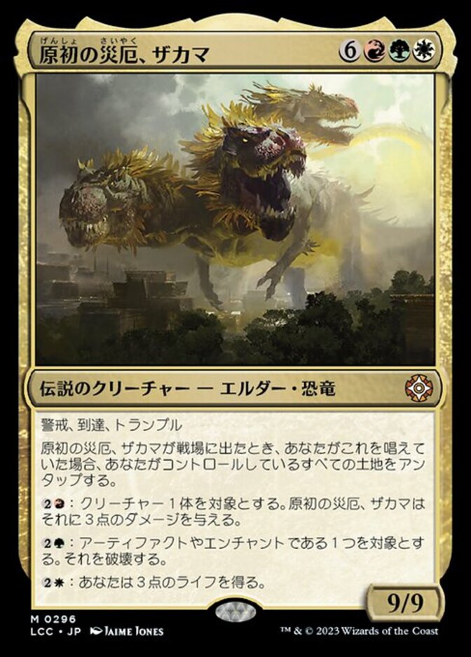 | Rules | Vigilance, reach, trample When Zacama, Primal Calamity enters the battlefield, if you cast it, untap all lands you control. : Zacama deals 3 damage to target creature. : Destroy target artifact or enchantment. : You gain 3 life. |