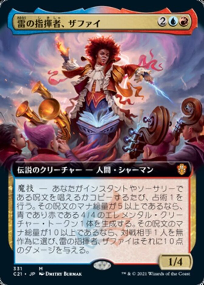 | Rules | Magecraft — Whenever you cast or copy an instant or sorcery spell, scry 1. If that spell's mana value is 5 or greater, create a 4/4 blue and red Elemental creature token. If that spell's mana value is 10 or greater, Zaffai, Thunder Conductor deals 10 damage to an opponent chosen at random. |