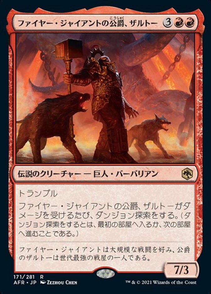 | Rules | Trample Whenever Zalto, Fire Giant Duke is dealt damage, venture into the dungeon. (Enter the first room or advance to the next room.) |
