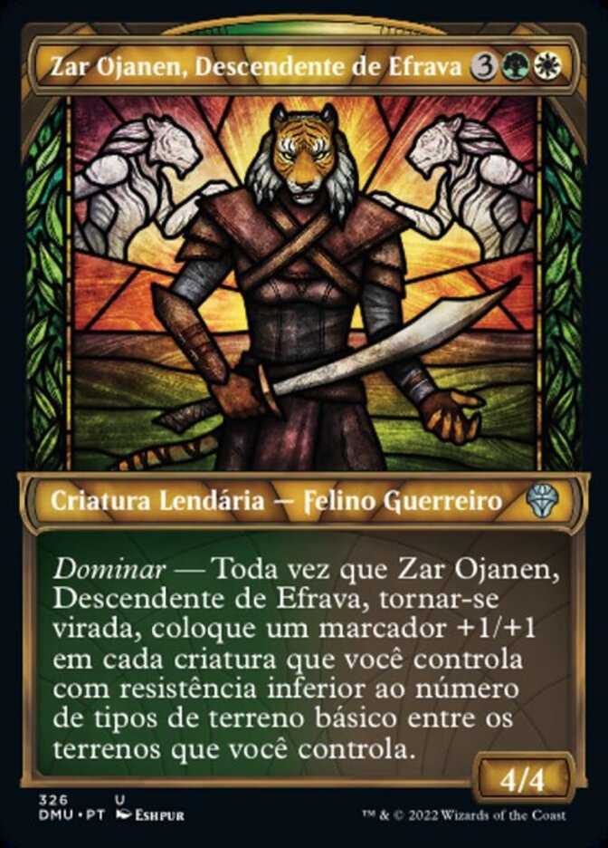 | Rules | Domain — Whenever Zar Ojanen, Scion of Efrava becomes tapped, put a +1/+1 counter on each creature you control with toughness less than the number of basic land types among lands you control. |