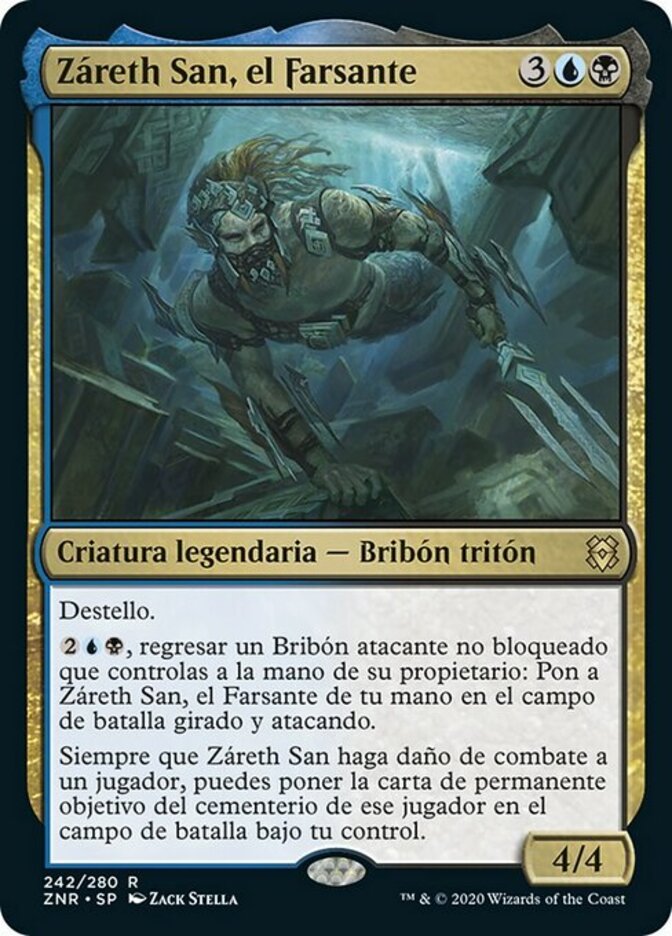| Rules | Flash , Return an unblocked attacking Rogue you control to its owner's hand: Put Zareth San, the Trickster from your hand onto the battlefield tapped and attacking. Whenever Zareth San deals combat damage to a player, you may put target permanent card from that player's graveyard onto the battlefield under your control. |