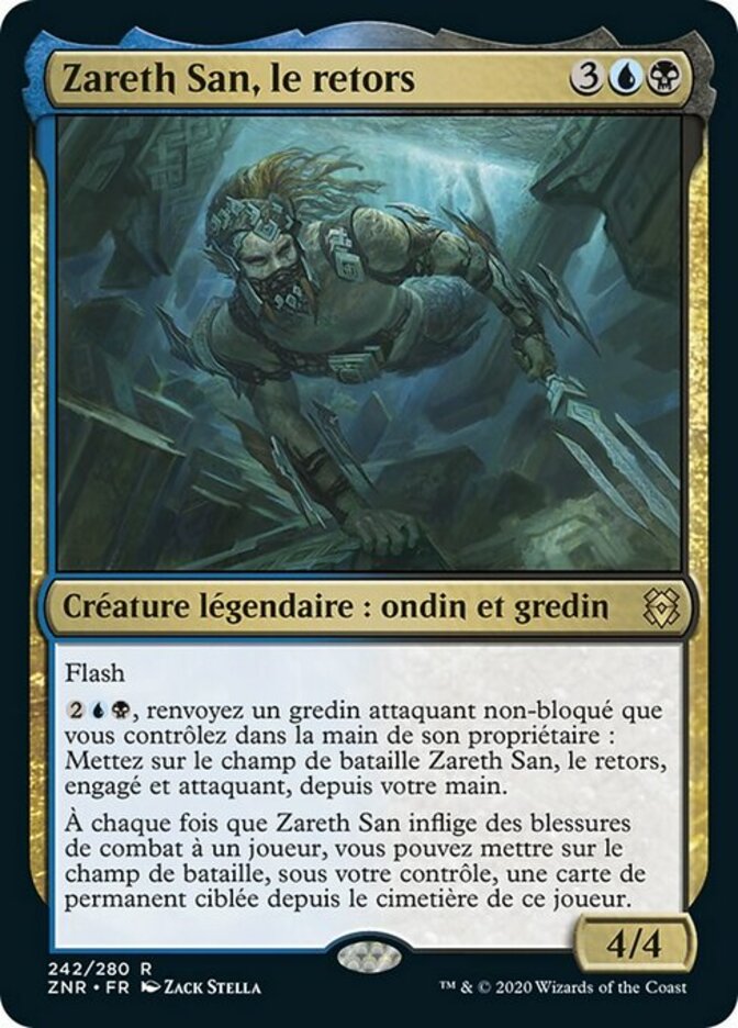 | Rules | Flash , Return an unblocked attacking Rogue you control to its owner's hand: Put Zareth San, the Trickster from your hand onto the battlefield tapped and attacking. Whenever Zareth San deals combat damage to a player, you may put target permanent card from that player's graveyard onto the battlefield under your control. |