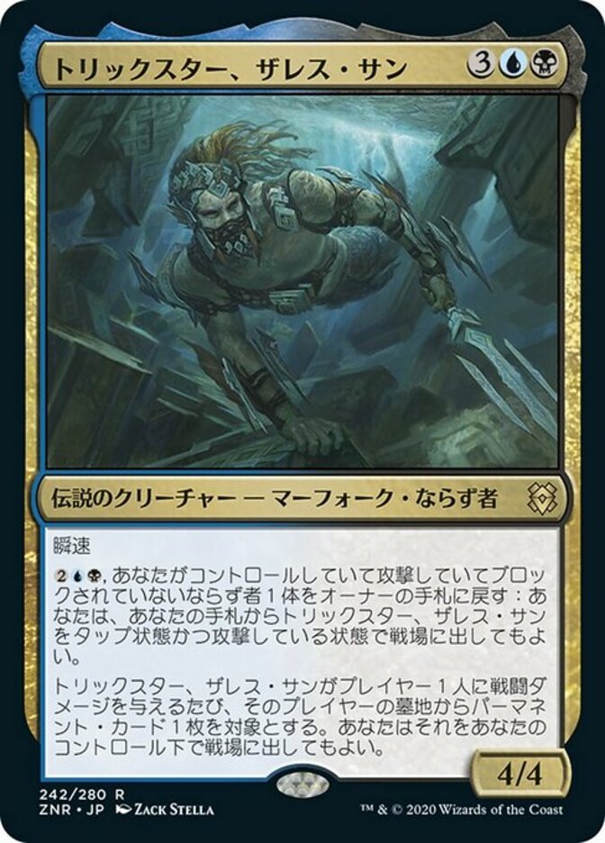 | Rules | Flash , Return an unblocked attacking Rogue you control to its owner's hand: Put Zareth San, the Trickster from your hand onto the battlefield tapped and attacking. Whenever Zareth San deals combat damage to a player, you may put target permanent card from that player's graveyard onto the battlefield under your control. |