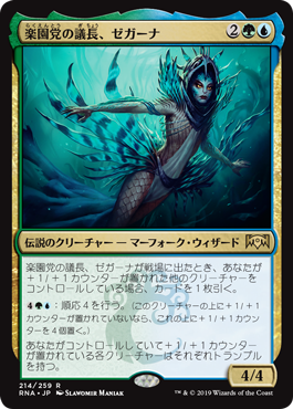 | Rules | When Zegana, Utopian Speaker enters the battlefield, if you control another creature with a +1/+1 counter on it, draw a card. : Adapt 4. (If this creature has no +1/+1 counters on it, put four +1/+1 counters on it.) Each creature you control with a +1/+1 counter on it has trample. |