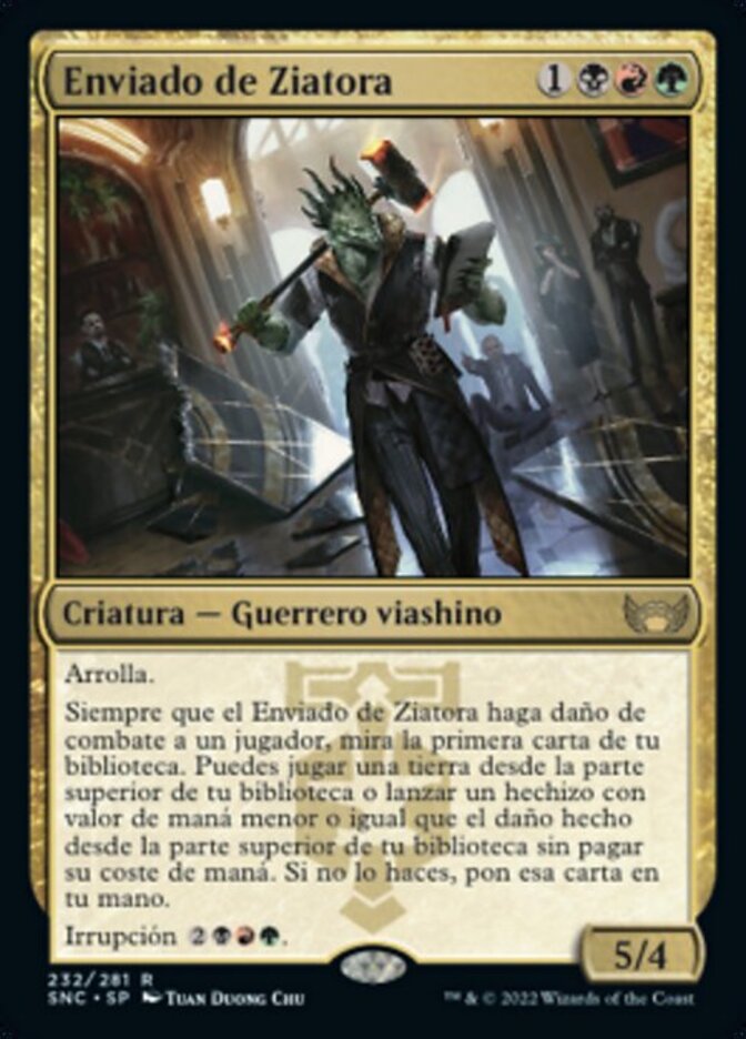 | Rules | Trample Whenever Ziatora's Envoy deals combat damage to a player, look at the top card of your library. You may play a land from the top of your library or cast a spell with mana value less than or equal to the damage dealt from the top of your library without paying its mana cost. If you don't, put that card into your hand. Blitz |