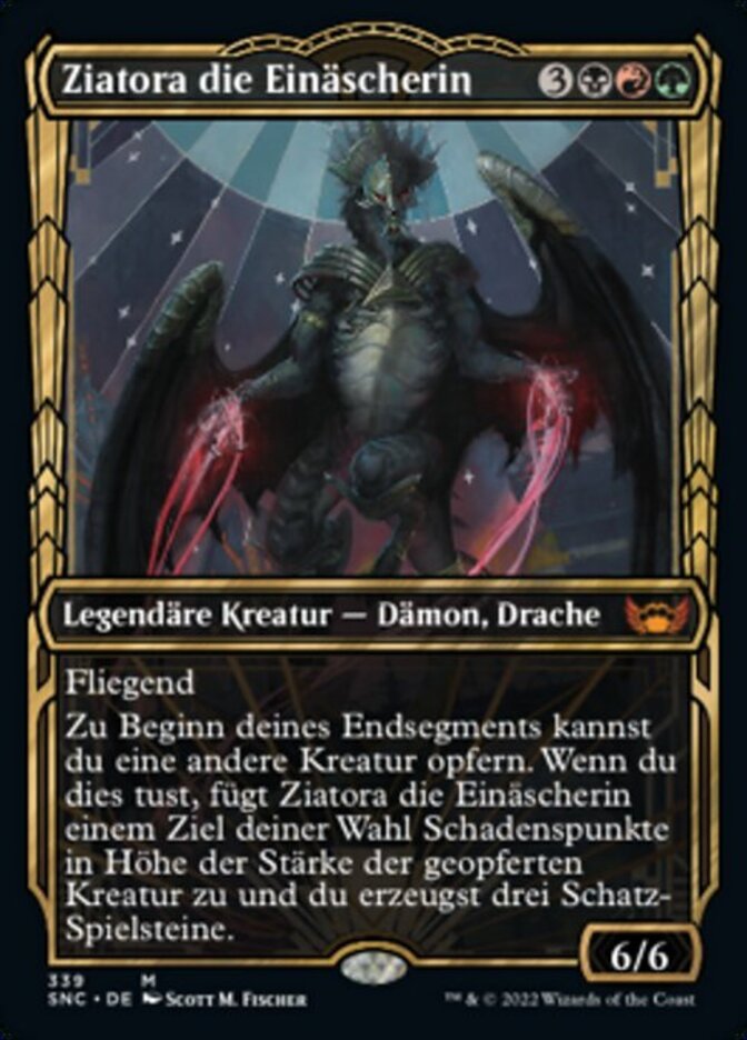 | Rules | Flying At the beginning of your end step, you may sacrifice another creature. When you do, Ziatora, the Incinerator deals damage equal to that creature's power to any target and you create three Treasure tokens. |