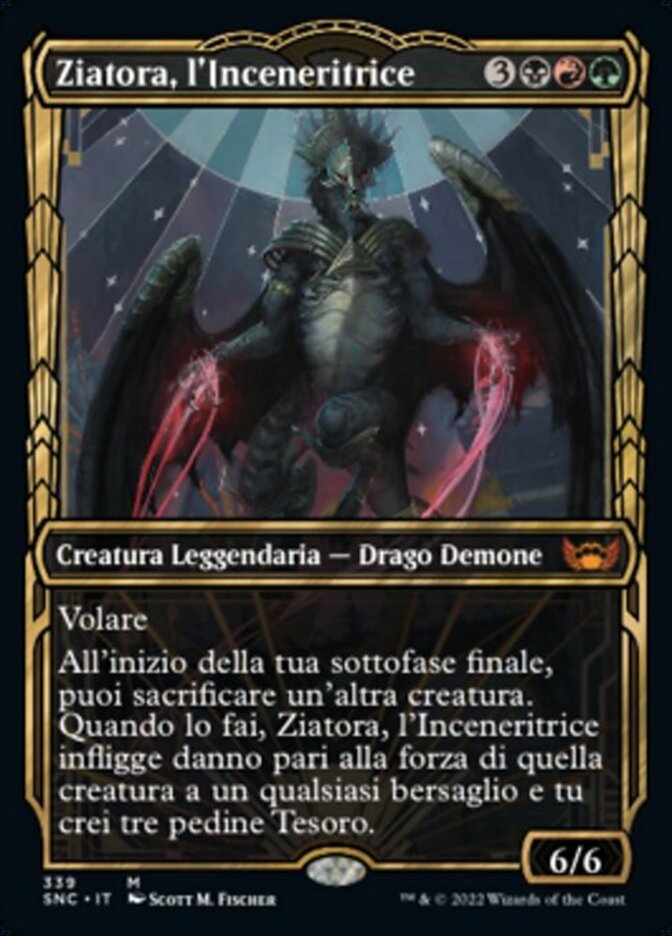 | Rules | Flying At the beginning of your end step, you may sacrifice another creature. When you do, Ziatora, the Incinerator deals damage equal to that creature's power to any target and you create three Treasure tokens. |