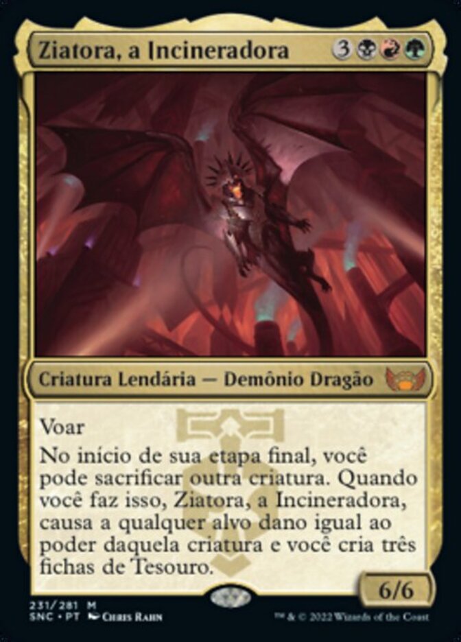 | Rules | Flying At the beginning of your end step, you may sacrifice another creature. When you do, Ziatora, the Incinerator deals damage equal to that creature's power to any target and you create three Treasure tokens. |