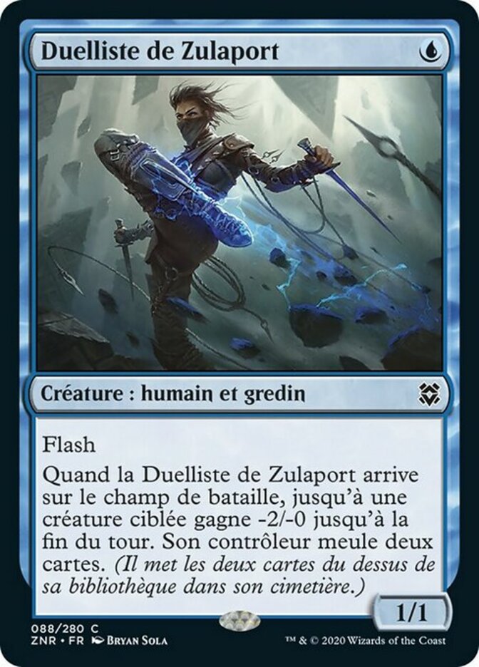 | Rules | Flash When Zulaport Duelist enters the battlefield, up to one target creature gets -2/-0 until end of turn. Its controller mills two cards. (They put the top two cards of their library into their graveyard.) |